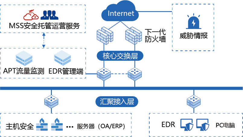 方案:海域云应急团队入场处置,隔离受感染设备并保护关键服务器,阻断病毒进一步扩散,并协助修复被加密数据。同时在核心层部署APT流量监测,在电脑终端安