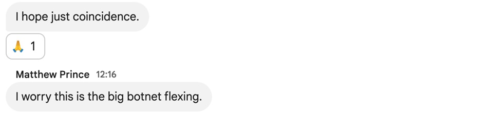在内部事件聊天室中,我们担心这可能是近期Aisuru高流量 DDoS攻击的延续: