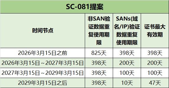 SANs(域名/IP)验证数据的重复使用期限从398天减少至10天。