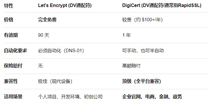 但如果你是在为公司部署正式业务,尤其是要面对全球客户,选择 DigiCert 之类的商业版证书能让你省去很多由于兼容性或自动续期失败带来的麻烦。