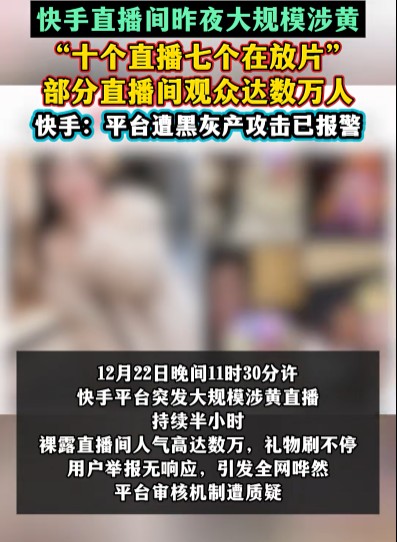 2025年12月22日深夜,快手直播频道突发大规模违规内容,大量涉及淫秽色情、血腥暴力的画面在多个直播间同时出现。