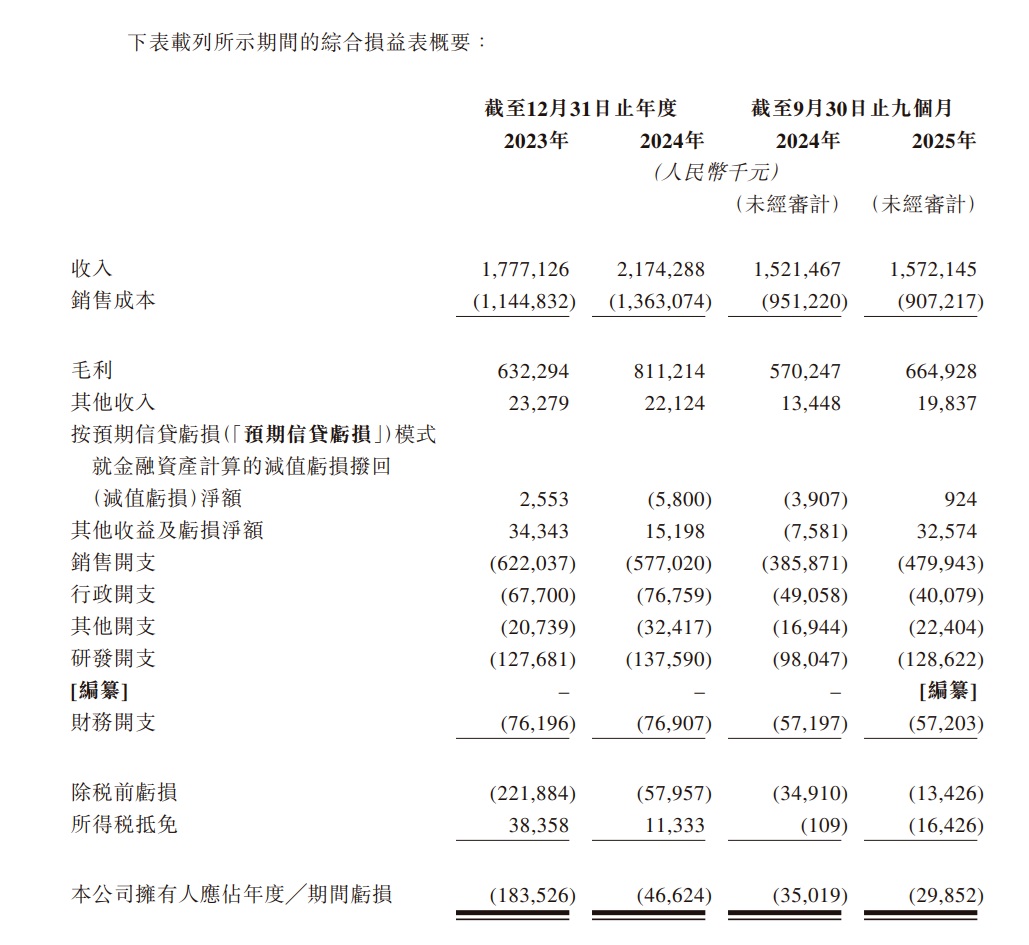 尽管市场表现亮眼,德兰明海的上市之路仍布满荆棘。首当其冲的是持续未决的盈利难题,招股书显示,2023 年至 2025 年前三季度,公司期内亏损分别为 1.84 亿元、4662.4 万元及 2985.2 万元,净利润虽在 2024 年转正为 0.2 亿元,但至今未能覆盖历史亏损。公司坦言,由于仍处于业务扩张阶段,未来可能持续产生净亏损。